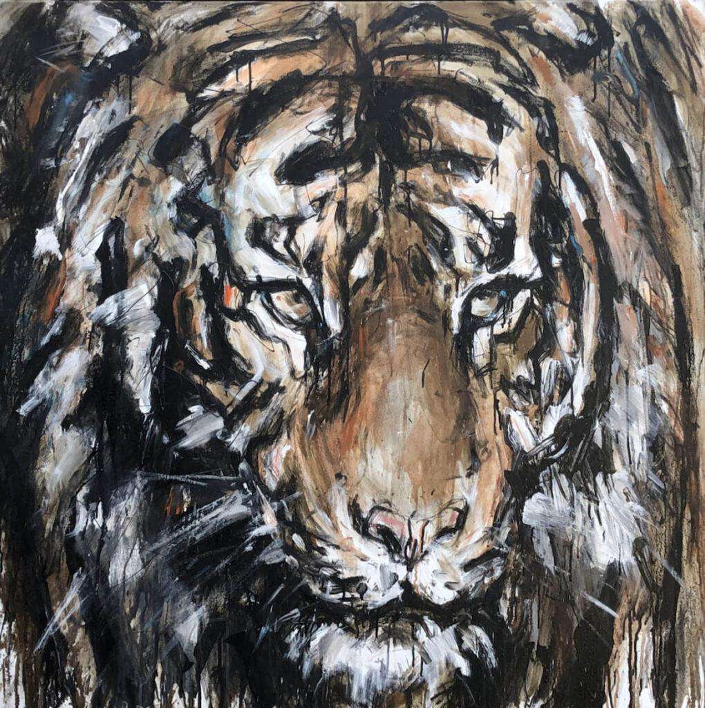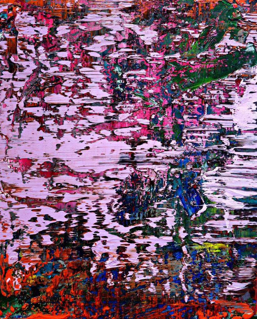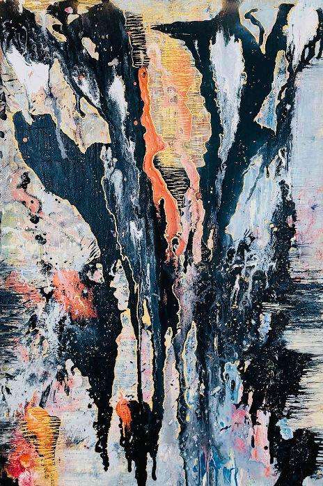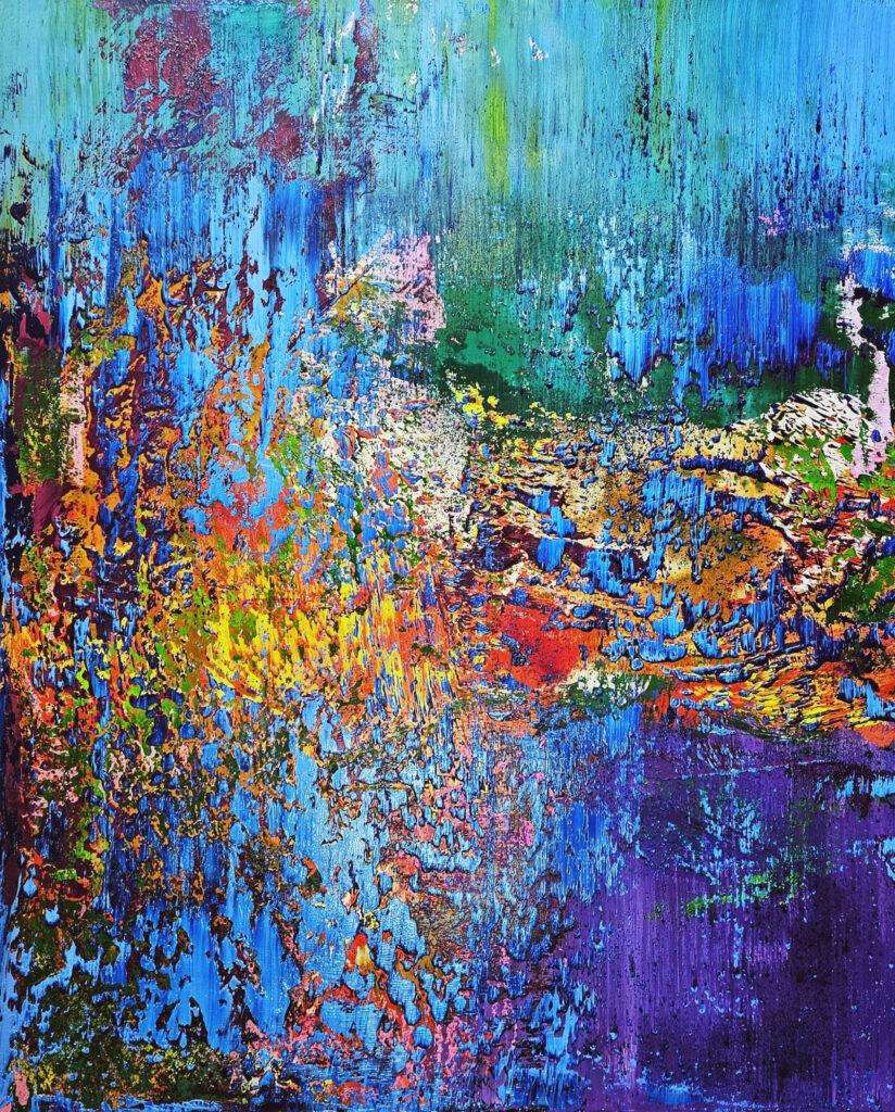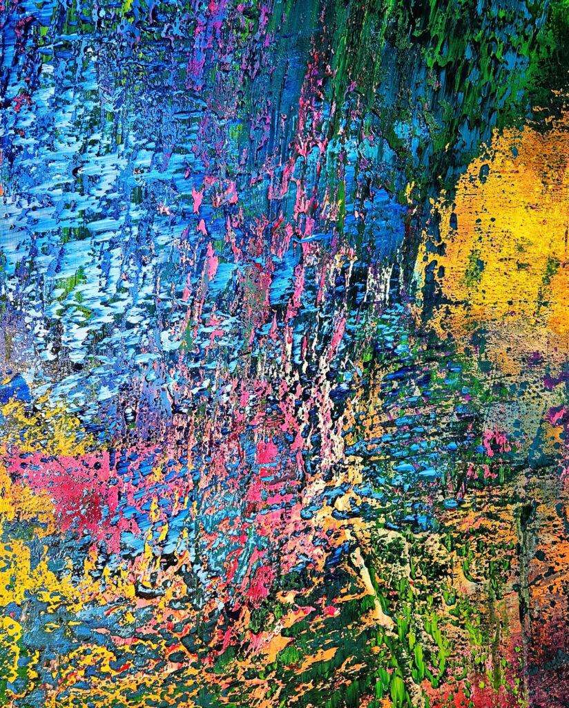 Each of her works is a visual color battle. There are no boundaries, no rules, colors and shapes mingle and bring the canvas to life. Whether with rags, sponges, palette knives, paint rollers or other everyday objects, she uses any means to bring the complex structures of her abstract works to the canvas.