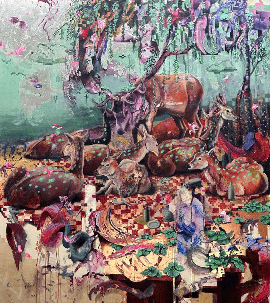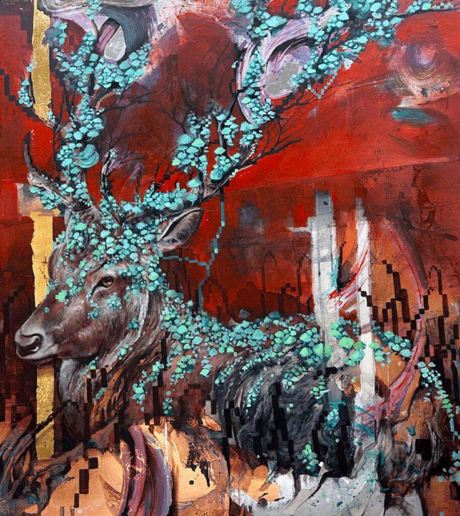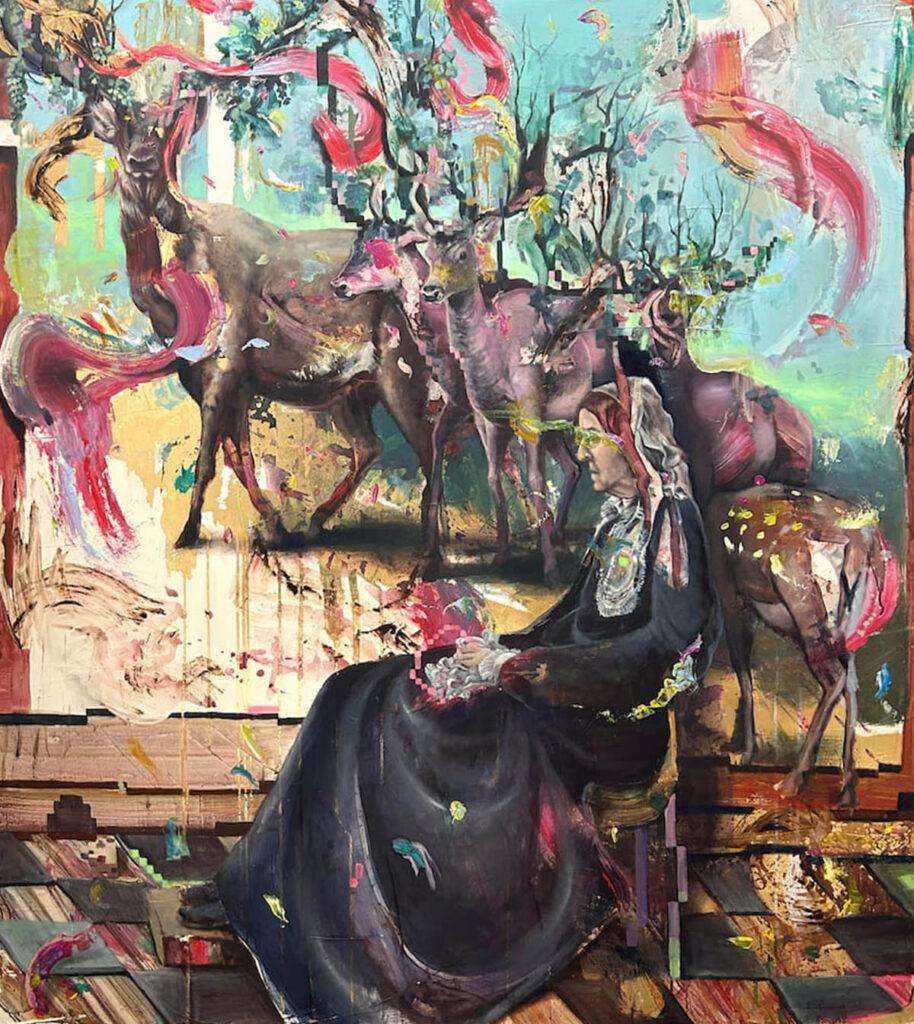 The young artist, who also studied biology, explores his compositions as a visual narrative that is ready to comment on society and humanity through his characteristic use of historical references, pixel elements and the diffusion of faces.