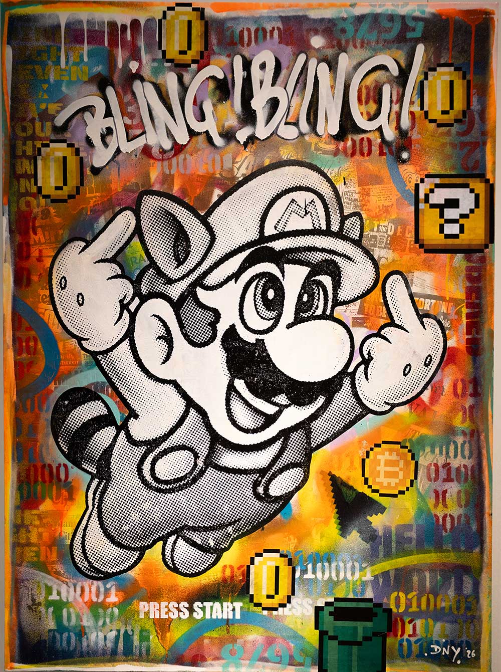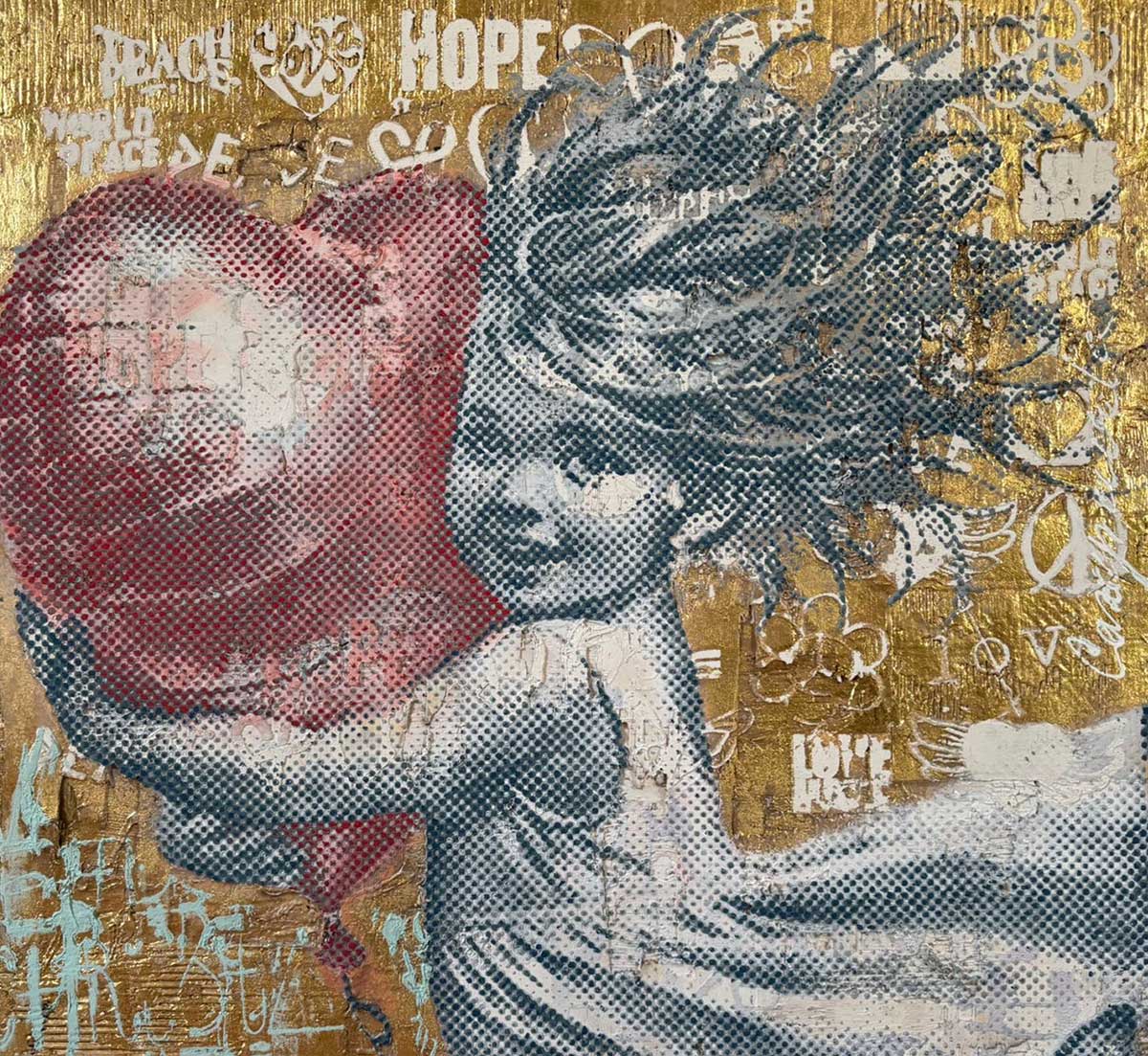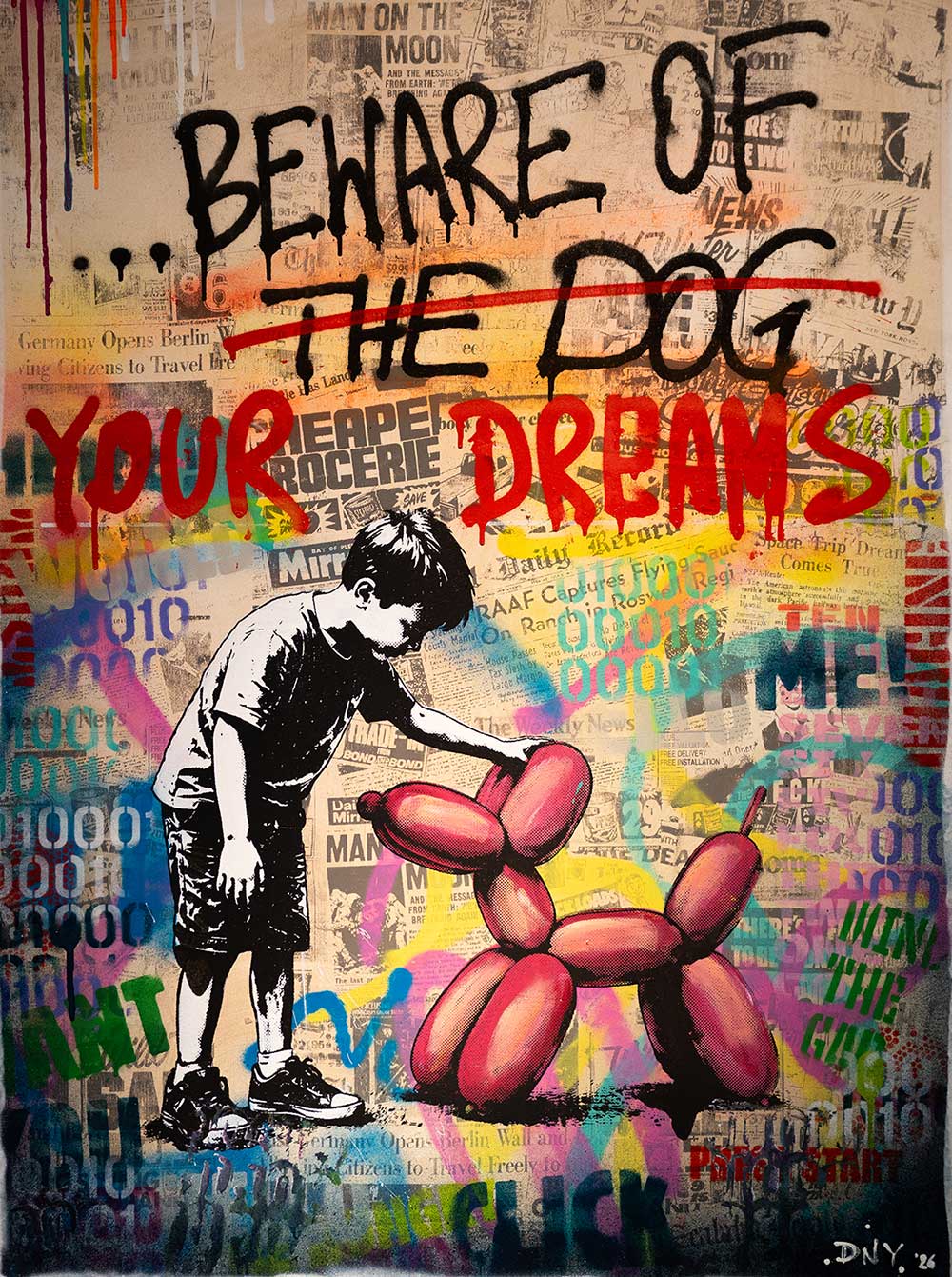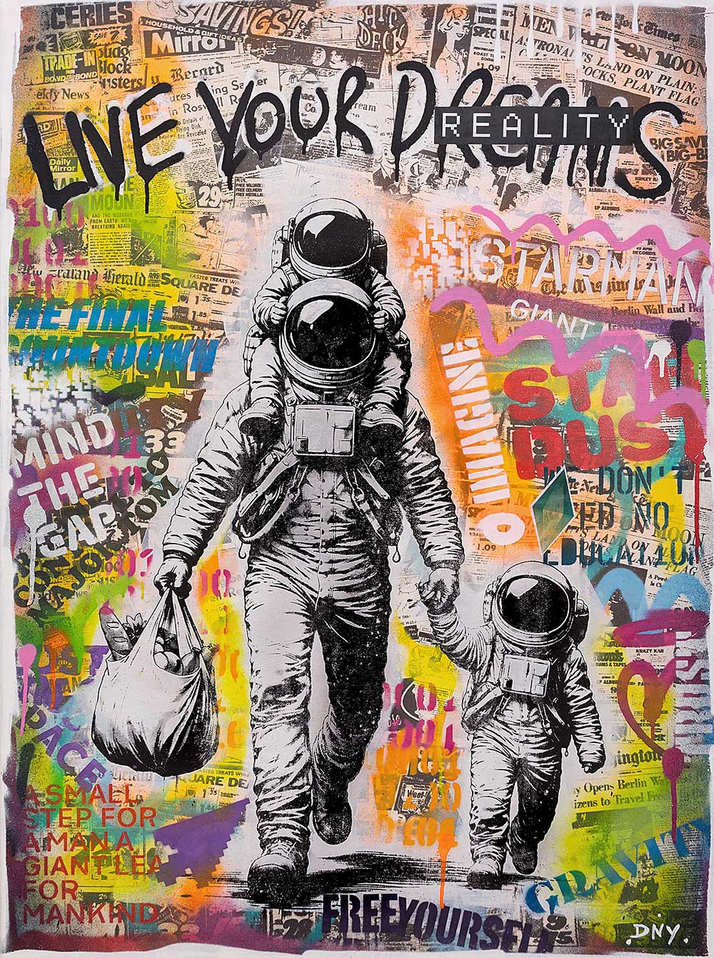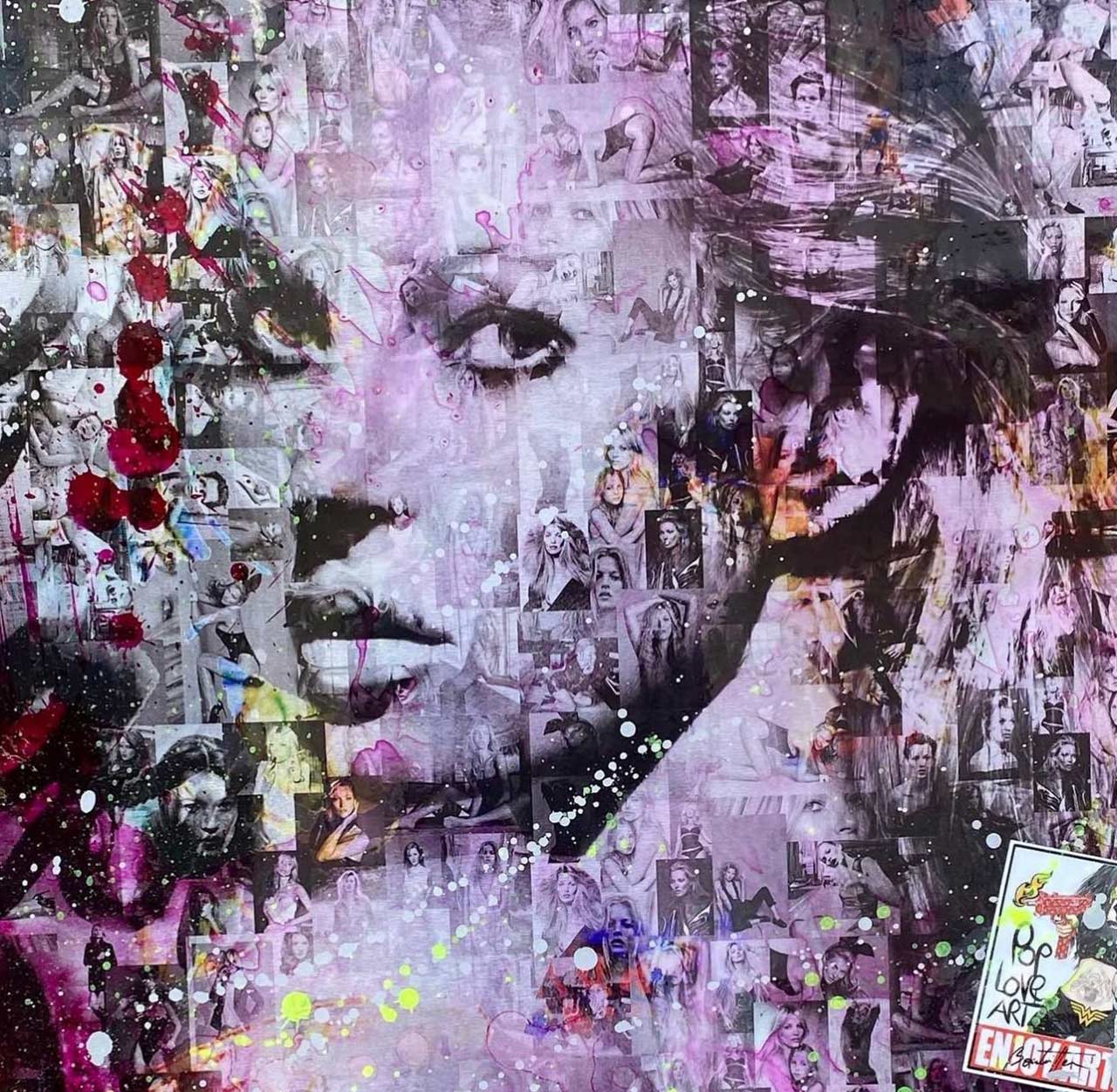 Michel Friess creates his outstanding and elaborate one-off pieces entirely by hand in his studio in Kaiserslautern, in south-west Germany. His wife Mel assists him. The attention to detail is unmistakable. His paintings tell stories; they captivate the viewer and their thoughts, and one constantly discovers something new within them. His works are created using complex techniques such as painting, spray cans, hand screen-printing, paint rollers, wild splashes of paint, as well as the use of iconic newspapers, posters and rare comic books… all of which make every artwork absolutely unique.