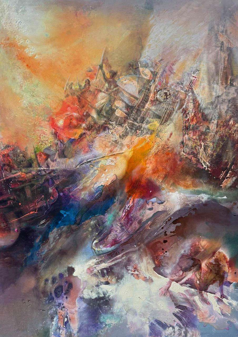 Each of her works is a visual color battle. There are no boundaries, no rules, colors and shapes mingle and bring the canvas to life. Whether with rags, sponges, palette knives, paint rollers or other everyday objects, she uses any means to bring the complex structures of her abstract works to the canvas.