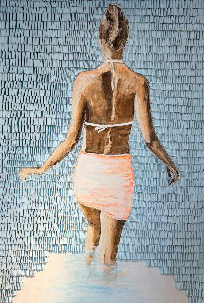 In terms of content, iconic figures from art history encounter women from everyday life and current social contexts. She often works with recycled materials such as cardboard, jute sacks or textiles; the relief-like surfaces are created in a complex layering process.