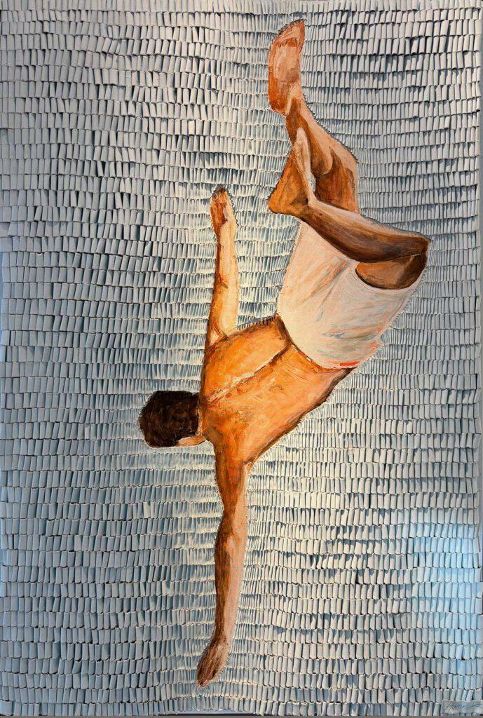 With her characteristic looping technique, she translates movement sequences into rhythmic lines and powerful brushstrokes, creating a dialogue between figures and space. She works predominantly with acrylic on canvas; layers create a pronounced depth effect, even a sculptural presence.