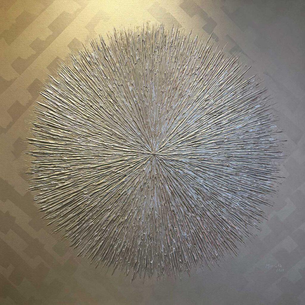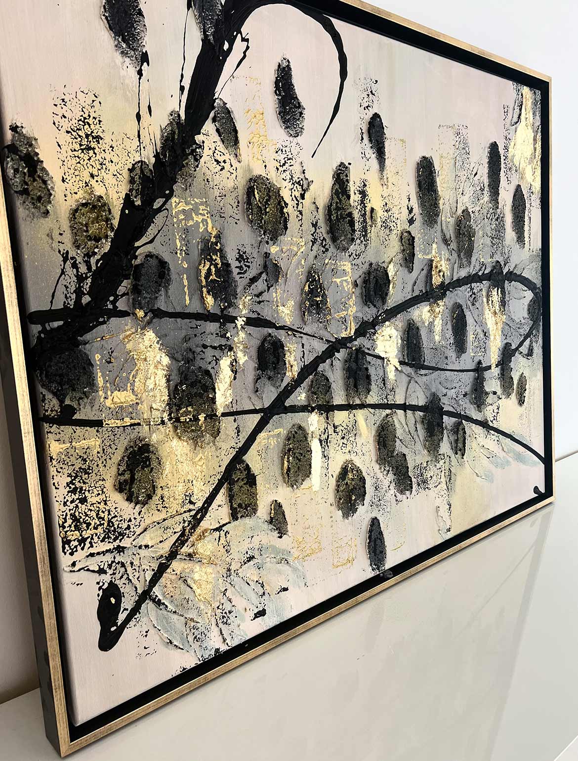 has developed a passion for collages and three-dimensional assemblages, which make her works unique. Melanie deliberately uses natural materials such as wood and natural fibres, combining them with a dynamic mixture of acrylics and radiant gold and silver colours. Her artistic approach is direct and hands-on, which further enhances the intense expression of her visions.