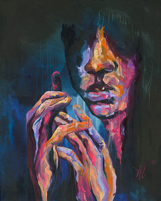 Ich kombiniere expressive Farbgebung mit abstrakten und figurativen Elementen, um emotionale Tiefe und Authentizität zu vermitteln. Der kreative Prozess ist für mich ein Akt der Selbstbegegnung – ein Dialog zwischen inneren Empfindungen und äußeren Ausdrucksformen. Durch meine Kunst möchte ich Räume schaffen, in denen Betrachter ihre eigenen Gefühle und Gedanken erkunden können.